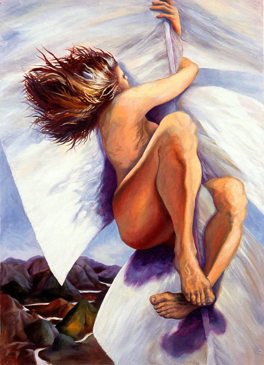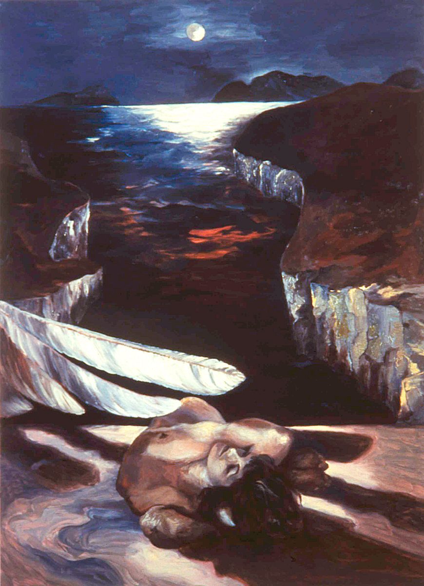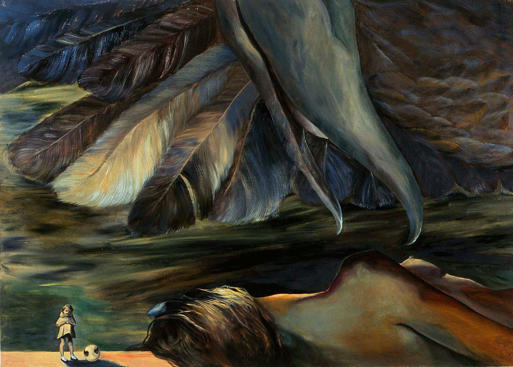 I have used recurring symbols in this series, One is the giant jingle bell, a medieval symbol for the jester/fool. Another is her nearly constant companion, a giant bird. The bird is sometimes a sheltering presence, sometimes a horrific harbinger of things that must be faced, of the necessity to explore hidden truths in ourselves. Always it is an equivalent for divine intervention, transcendence.