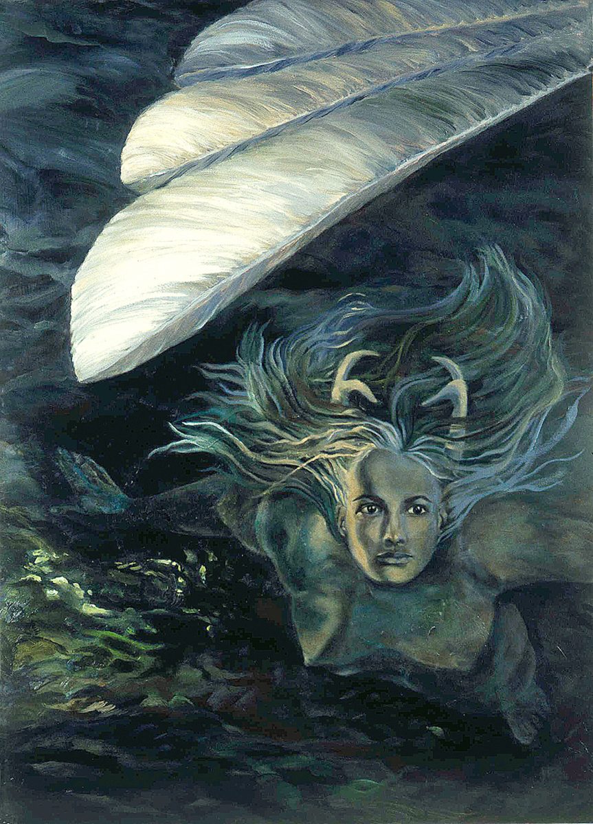 As an archetype, the Fool is a character who breaks down rules and social conventions, sometimes fueled by an innocent naivete that may lead to dangerous encounters. In this series, the Fool is a naked, horned female character. She is naked because she reminds us that rules, assumptions and rituals are merely a set of conventions, optional like clothes. She is horned because she embodies the evolution of consciousness that would heal the broken connection between ourselves and our animal existence, between the earth and ourselves. She is placed in varied circumstances and surroundings because this is the picture of an individual soul meeting life, taking risks, developing consciousness, confronting fear and ultimately finding balance in surrender.