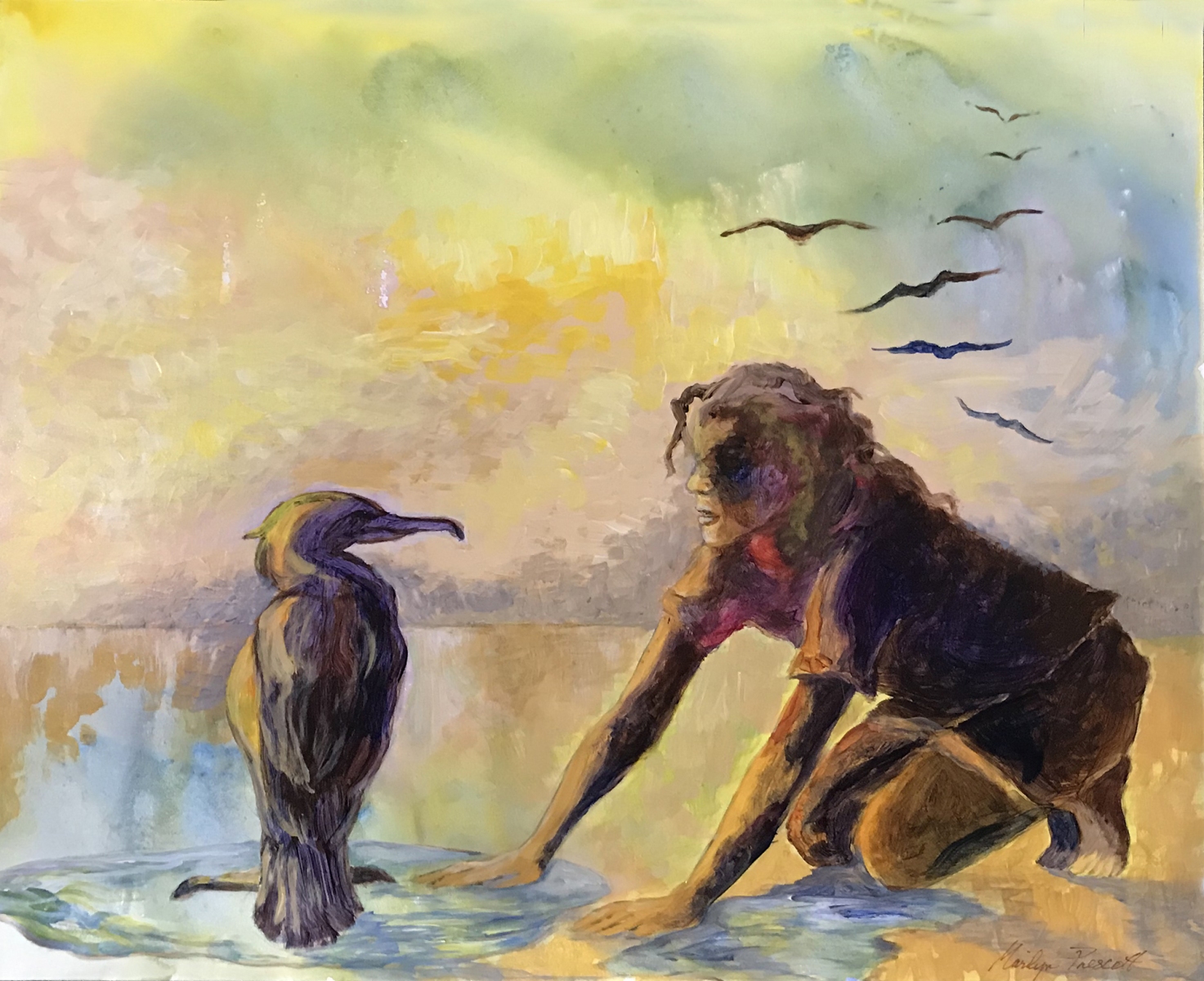 These paintings began during a walk one morning when I came upon a dead bird. I took a photo and later made a drawing, then a painting. Within a few days I came upon several more dead birds and so decided that this would form the genesis of my new series. I used the photos on the small canvasses and made paintings from each, as a sort of homage. From that beginning I combined the dead and dying, and falling, tumbling birds in compositions with women. Pregnant women, grieving women, young mothers, appalled and disgusted women all became my statement of my very, very disturbed and aggrieved feelings about the cultural and political state we’d come to in the U.S.